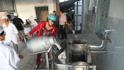 Paul Mueller Company has partnered with FrieslandCampina Vietnam to supply milk cooling tanks in Asia. FrieslandCampina strategically places the milk cooling tanks in central locations as part of the farmer support system. Small farming families bring their milk churns to one of the central collection points twice daily and pour it into a Mueller dump unit. The milk is then stored and cooled in Mueller tanks. At some collection points, the milk of about 70 farmers is gathered.