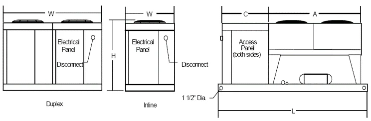 | Unit Model | Length - in (cm) | Width - in (cm) | Height - in (cm) | A - in (cm) | C - in (cm) | Unit MCA 208-230/60/3 - amps | Unit MCA 460/60/3 - amps | Unit MCA 575/60/3 - amps | Liquid Connection - in (cm) | Suction Connection - in (cm) | Shipping Weight - lbs (kg) |